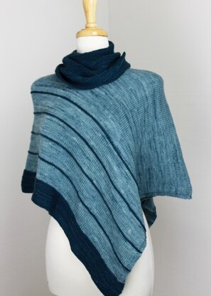 This poncho is an innovative piece that is worked in two colors. It is knitted from the bottom up from the hem in one piece. The stitches for the cowl neck or optional crew neck are picked up around the neck edge after the body has been completed. The "sleeves" fall just below the elbows, which helps to show off a lady's figure, giving this poncho a very flattering look.