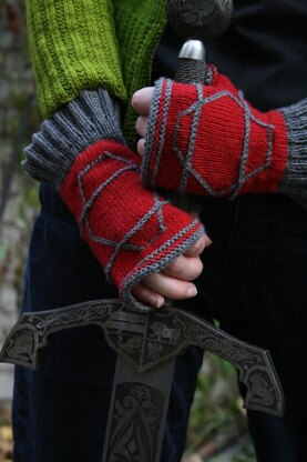 Inspired by the comic book heroin Lady sif , from the Thor series. She is one of the best warriors of Asgard , the home world of the Norse gods. Her prefered weapons are a long sword and shield. The mitten are designed to look like her armor, the cuff looks like the battle skirt she wears, the hand is like her body armor and the garter stitch on top are a representation of her diadem.