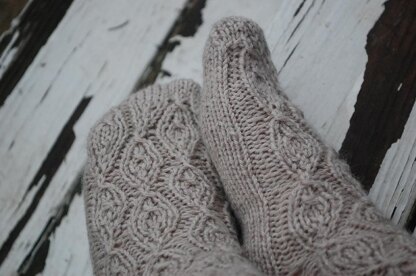 Got caught again this winter with an empty drawer of hand knit socks? At a gauge of 4 stitches to the inch, these attractive socks knit up in no time at all and could be a quick solution to your sock shortage. They’re super comfy and pair nicely with a wintry pair of clogs. Grab a nice winter lager, and cuddle up on a chilly evening enjoying the sturdy flavor of both your beverage and your knitting project.