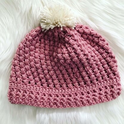 Cozy puffy stitch beanie worked from the bottom up and topped off with the sweetest of poms.