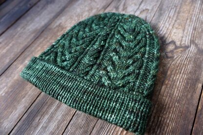 Der Lake Reed ist eine warme Mütze mit Umschlagbündchen. Die Abtrennung der Zopfmuster ist durch linke und rechts verschränkte Maschen dicht und lässt nur wenig Wind durch.
