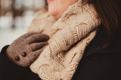 Infinity cowl with cables, knit in the round. Finished by folding cowl inward and seamlessly grafted for a cozy finish.