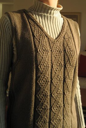 This handsome unisex vest is accented with diamond twisted stitch panels on both the front and back. On the back, each of the three panels is identical; on the front, the side panels are mirror images, so that the stitfch patterns on each side of the V-neck will be symmetrical. The neck and armholes are self-finished (worked at the same time as the body: no edging needs to be added); the neck edge pattern flows from the twisted stitch pattern, and the armhole edging, from the vest side accents (see photos). Three different lengths are given for each size to coordinate the length of the stitch pattern with personal measurements; this also allows each size to easily be adapted for a man or woman. Laredo is worked in the round from the bottom up to the armholes, with no waist shaping. The upper front and back are worked flat, and the shoulders are joined using three-needle bind off.