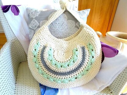 I have made this bag in three pieces. A front and a back section, which are identical, and a long circular piece which forms the strap. The strap wraps around both sides of the bag giving it strength and durability. For this pattern I have used a 12 ply chunky cotton/acrylic but I have also made this bag in a 10 ply cotton and it looks just as good but will be a little smaller.