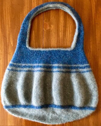 Purse is knit in one piece. Base is knit flat in an oval shape. Stitches are picked up all around the edges of the base and then knit in a round. Color changes and decreases are made as you go. Straps are worked separately and attached together at the top with kitchener stitch. An i-cord edge is added to the handle and around the base of the bag.