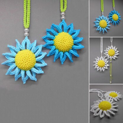 The large, three-dimensional flower is very easy to crochet from scraps of yarn in your favorite colors and looks great as a decorative hanger on doors, windows, walls or doorknobs.