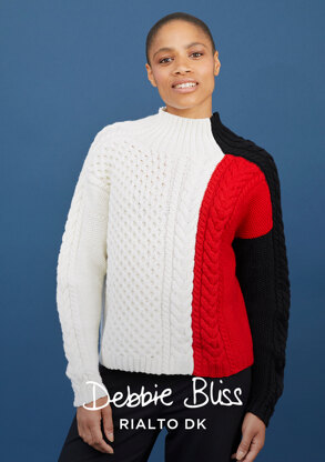 Ooooh Larissa is a block colour and texture paradise! If you love cables and moss stitch, you are going to enjoy knitting this fabulous sweater, that uses three different cables (we love the honeycomb!) and block colour sections for drama. Rialto DK is the perfect yarn for this kind of texture - it has great stitch definition and there are 35 colours to choose from, so you can make that colour blocking your own!