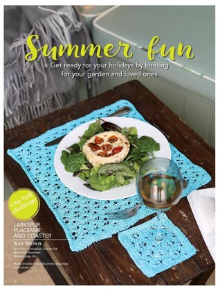 This is a pattern for Larkspur Lace Placemat, originally published in Knitting magazine. It is in a larkspur lace stitch wit garter stitch edges, and a caoster 11 x 11 cm. Photo Knitting magazine.