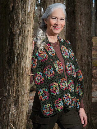 Wrap yourself in a field of flowers all winter with this V-shaped shawl that will stay on your shoulders. Made with join-as-you-go crochet motifs, the colorful flower-inspired centers get a solid-color frame that helps them pop.