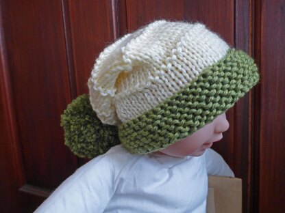 This cute slightly slouchy hat has a garter stitch brim and a stocking stitch body with some garter stitch ridges. It is knit using two contrasting colours and topped with an optional pompom, however it could be made using one colour only. The hat is knit flat on two needles with a seam at the back.