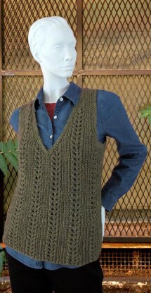 Classic V-neck styling with slipped stitch ribbing and simple lace panels combine with a cozy alpaca/wool blend for a perfect layering piece. The body is worked in the round from the bottom up, divided to begin the V-neck, then divided again at the armholes to work the back and both halves of the front separately. Short-rows are used to shape the shoulders. When beginning the neck shaping, stitches are cast on for the left front neck border so the neckband is worked along with the fronts. After the multi-stitch bind-offs to begin the armhole shaping, you’ll pick up stitches along the shaped edge, then cast on 5 more and use those 5 stitches to work the ribbing as an applied edging until all the picked up stitches have been decreased out of work. The remaining armhole shaping is completed by working single-stitch decreases between the front/back and the edging. The back neckband is also worked as an applied edging, then the stitches grafted together, or joined using 3-Needle BO.