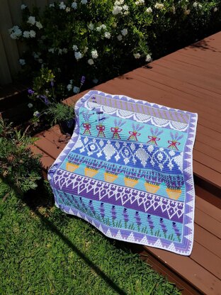 The pattern contains written instructions as well as charts marked with Xs. There are seven designs plus the border. Five designs have stitch repeats of 24 which are common to a lot of other patterns, so you can mix and match if you wish. It includes information about how to make larger blankets. Choose contrasting colours so the pattern stands out.