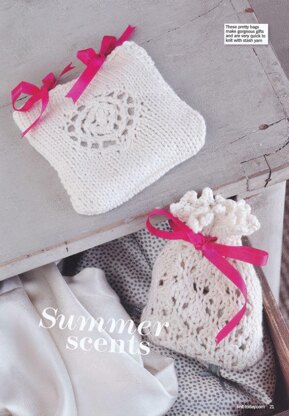 This is a pattern for Lace Lavender bags, originally published in Knit Today. There are two lavender bags. One is a lace motif on stocking stitch with a plain back, with ribbon ties, the other is an all over lace stitch with eyelets, a picot edge and ribbon. The yarn has now been discontinued, any yarn knitting to the dk tension can be used. You will also need thin fabric, dried lavender, narrow ribbon. Photo Knit Today.