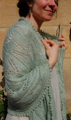 The sample was worked in Five Moons Drifter Lace. A substitute yarn is shown below. The larger needle is required for casting on and off only. You can make the stole narrower or longer, and in heavier weight yarn, but you must adjust meterage accordingly.