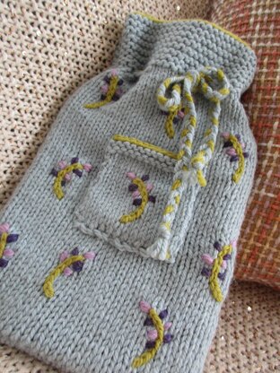 This is a pattern for a Lavender Hot Water Bottle Cover. It fits a small hot water bottle, 1 litre. It is a simple to make project good for beginners. It is made in stocking stitch, with a garter stitch top with eyelets and a plaited tie. A pocket on the front contains a lavender bag, and there is lavender embroidery on the front. Any aran yarn in small amounts can be used for the embroidery.