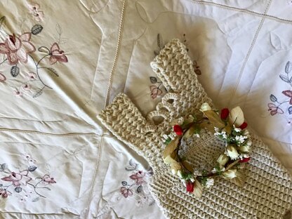 Unique design in the Lavender Lamb Pinafore. Free form crocheted bib motif. Stylish motif at the hem. Textured with raised stitches throughout. Crocheted entirely in one piece with no seams. Simple crochet stitches used. CARON BRAND ONE POUND YARN USED IN THIS PATTERN.