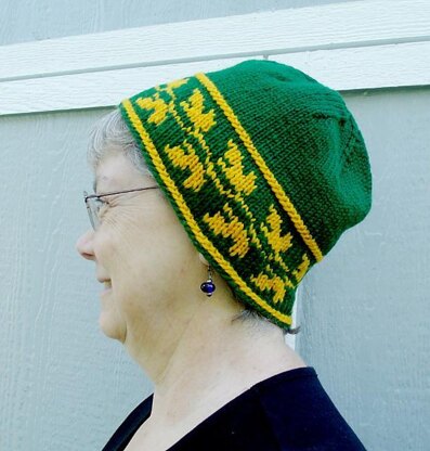 The Leaf Cuff Hat begins with an Old Norwegian cast-on method and features colored leaf motifs along the brim. A Double Purl stitch mimics the cast-on at the top of the cuff.