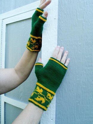 The Leaf Cuff Mitts begin with an Old Norwegian cast-on method and feature colored leaf motifs along the mitt cuffs. A Double Purl stitch mimics the cast-on at the top of the cuff and edges of the hand and thumb.