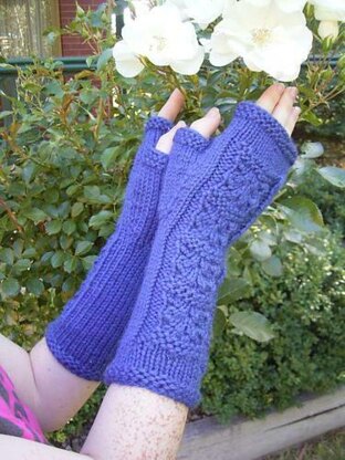 Nice warm fingerless mitts with a leafy squares patterns running along the back. A thumb gusset is worked. The mitts are worked on double pointed needles, but can be done using Magic Loop if desired.