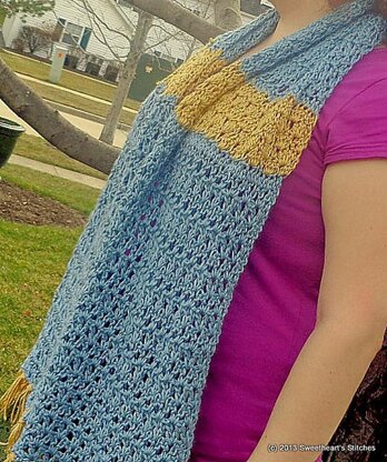 This scarf is inspired by the character of Leana, from the book Thorn in My Heart by Liz Curtis Higgs. Leana's husband, Jamie, describes her as "fashioned in gold and blue, the colors of the sky." When I found this gold and blue yarn, the image of this scarf immediately came into my mind. Made of squishy acrylic yarn, this scarf is like Leana: soft, warm, and comforting. The V-stitch lace pattern of the blue segments is delicate and gentle, and the solid shell pattern of the gold segments add a dash of something unexpected, as the other characters find to be true of Leana as well. I find myself wearing this scarf all the time; wrapping it around my neck or shoulders makes me feel warm and secure, like a grown-up blankie. The gold fringe around the bottom gives it a little flair.