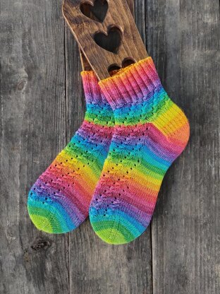 Simple traveling cable and yarn over stitch pattern works for self-striping yarn as well as semi-tonal or speckled. Pick your favorite colorway and enjoy knitting these socks!