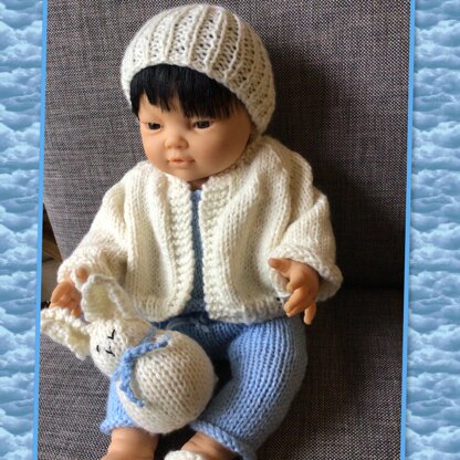 Lea loves wearing the outdoor outfit with a cute rabbit toy to take outside to be part of the adventures.. Knitted flat in DK yarn. Pattern includes cardigan, hat, top pants, shoes and a cute knitted rabbit. Works well with paintbox yarns.