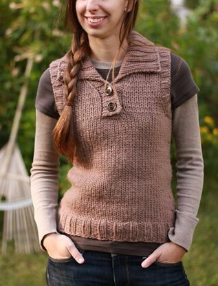 Ledge Trail Vest is a woman’s seamless pullover vest with buttoned placket and wide collar and uses super bulky weight yarn. It is knit from the bottom-up and all in one-piece to the underarm, then fronts and back are worked separately to the shoulders. Stitches are picked up and worked in 2x2 ribbing for the button band placket and armhole bands.
