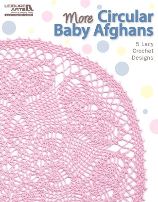 Leisure Arts More Circular Baby Afghans Crochet eBook- lacy crochet designs perfect for baby. If you're tired of making doilies, these snuggly lace blankets will give you are larger project with the same level of lace detail. Designs include: pinwheel, snowflake, twinkle twinkle, pretty in pink and more. Motifs include pineapple lace, filet crochet diamonds, shell shaped mesh, mile-a-minute borders, cluster stitch ruffles and much more. Projects call for size 4 worsted weight yarn and a US size I-9, 5.5 millimeter, crochet hook. Includes round-by-round instructions for each design and a general guide to crochet. Finished afghans measure between approximately 36" and 47 1/2" across. Easy skill level. 30 pages, PDF download.