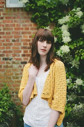 An open cardigan, worked in one large rectangle, makes a perfect layering piece for autumnal days. Worked from side to side, using the Catherine Wheel stitch, leaving spaces for sleeves, which are added on later. Wear open or use a shawl pin to hold in place.