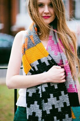 Inspired by woven rugs and shawls, the bold colours and geometry contrast with the naturally woven-like texture of tapestry crochet, create a shawl that can be dressed up or down.