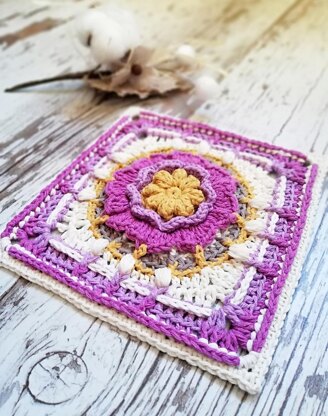 The square measures around 6” (16 cm) and grows from a textured central flower.