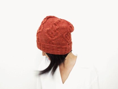 Hat is knitted in round from bottom up. 4” / 10 cm ribbing to be worn folded over. Skills: work in round. make increases (m1). make decreases (ssk, k2tog). work with cable stitches. Pattern includes chart and written instructions for the chart.