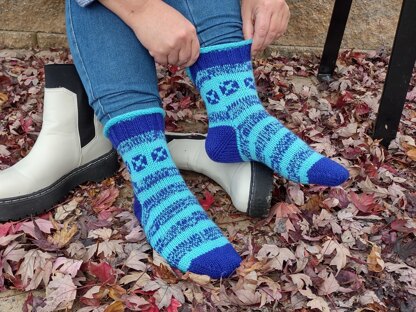 Let’s Mix Colors socks is a pattern that gives you the opportunity to play with 2 contrasting colors and create fun and cozy pair of socks. You’ll work with stripes and color blocks, and a little bit of colorwork (fair isle). Holding together 2 strands of fingering weight yarn, you’ll get the DK weight gauge, and socks work pretty quickly.