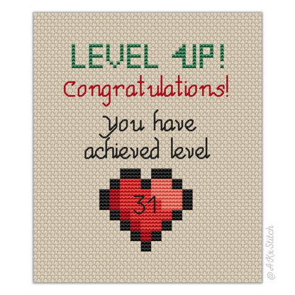 Level Up Counted Cross Stitch Pattern and PDF Digital Download. The pattern features a pixelated heart with numbers inside and words "Level Up! You have achieved level ...". Great handmade gift idea for Video Game Fans. Stitched on Aida 14ct: 9 x 11 cm (3 x 4 in)DMC Threads: 5 solid colours (0 blends)Used stitches: full cross stitch, backstitchSkill level: Easy / BeginnerStitch time: 5-10hCross stitch pattern in PDF, Instant Digital Download includes: 1) cover page with preview; 2) instructions, symbols key and shopping list (DMC thread colour numbers and estimates, as well as fabric options); 3) two black and white charts, with and without backstitch; 4) two colour charts, with and without backstitch; 5) single-page file for Pattern Keeper (available on request).Please note: This pattern is for personal use only - not for commercial use. You can't make copies of our charts to distribute (either as PDF or printed versions) but you can definitely sell your finished cross stitch work.