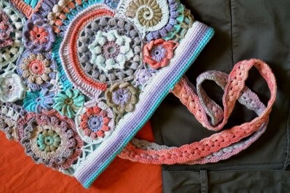 Final size:(individual sizes may vary due to tension and yarn used) Width: 13 in/33 cm Height: 14/35.5 cm Handle Length: 27.5 in/70 cm (or desired length)