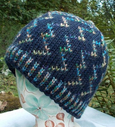 Bolts of Lightning zigzag up the sides of this hat, merging on the crown to form decorative diamonds, topped off with an I-cord “button”.