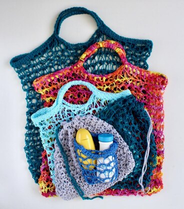 Pattern includes 2 variations of the Market bag (Regular and Stretchy) in 3 different sizes with soft, squishy handles and 2 different truly lightweight produce bags.