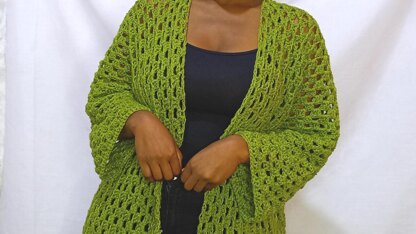 The crochet cardigan pattern is worn by a 34" bust model, it measures 34 inches long and 25 inches wide.