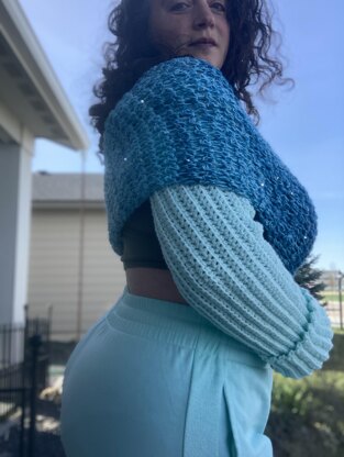 From the long sleeve to the open texture of the body this wrap sweater (or sweater scarf) is meant to be cozy and elegant at the same time! Sizes are written as: Bust/chest size A: 28-34” (B: 36-42”, C: 44-50”, D: 52-58”, E: 60-66”). Sleeve Length 1: 16” (2: 18”, 3: 20”) Sleeve is worn ¾ up the arm and has a cuff.