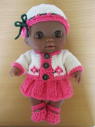 Easy to make Summer outfit for your Li'l Cutesies doll. There is no chart, the flower pattern is written out stitch by stitch so a beginner could make this. The pattern includes instructions for jacket, skirt, hat, panties and shoes. Worked on 3mm straight needles in DK yarn. Also uses crochet chain or 3mm ribbon, 3x 5mm buttons, shirring elastic.