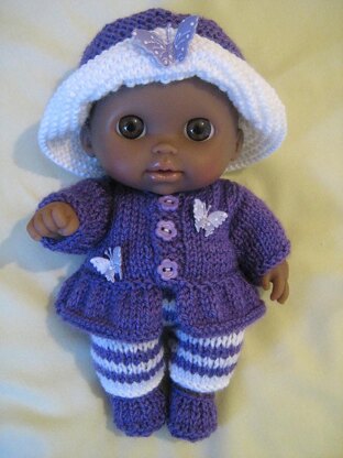 Easy to knit outfit for a Berenguer Li'l Cutesies Doll, comprising jacket, trousers, hat and shoes.