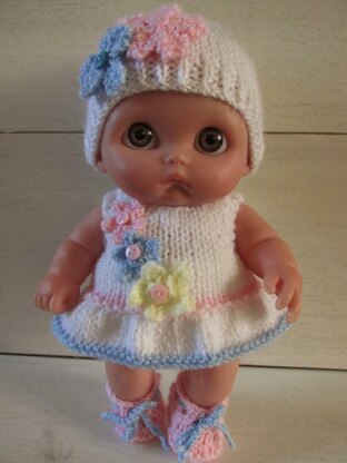 Really easy to make outfit for the Li'l Cutesie doll. Dress, hat, panties and booties knitted with straight 3mm needles. Uses knit and purl stitches, a beginner could easily make this. The flowers are made using 2.75mm needles but you could stitch on ready made flowers.
