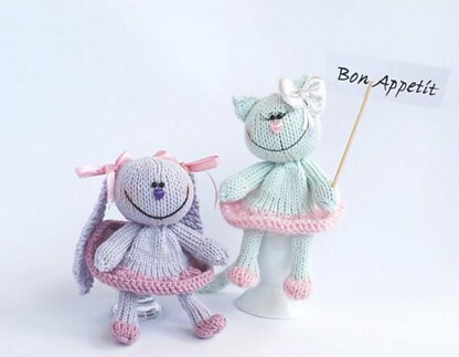 Lilac Bunny and Light pastel green Cat for keeping warm breakfast eggs The toy is knitted round and that is why the pattern is recommended for Advanced Beginner Knitters.