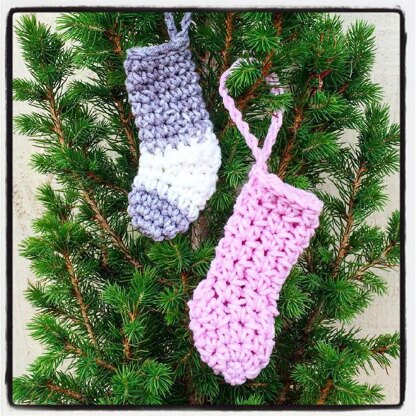 These mini Christmas stockings are available in 4 variations: plain, contrast heel, mesh/shell leg and full mesh/shell stocking. The 'shell' uses htr (US: hdc) but the plain stocking is simply dc (US: sc), so this pattern is suitable for beginners. The only difficulty is remembering to keep track of your stitch count because of the short rows!
