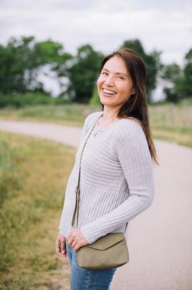 Have fun playing with lines in this beautiful piece featuring one long exaggerated pattern of horizontal lines that run cuff to cuff in this sideways sweater. The lightweight merino/silk fabric has wonderful drape allowing the lines at the bodice to widen with the weight of the bottom. Worked almost seamlessly with two short seams at each underarm, once the sideways top portion is finished, stitches are picked up around the body and worked in the rnd to the end, creating narrower, vertical lines.