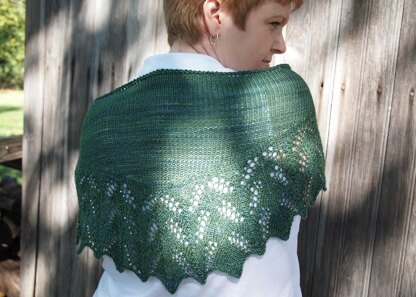 Lily Dew is a crescent shaped shawl featuring beaded lace at the bottom edge. Instructions for two sizes are included. The lace is a variation of the traditional Lily of the Valley lace.