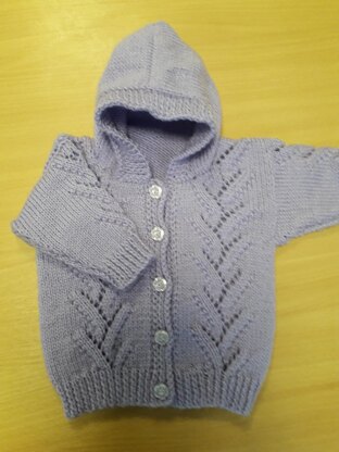 Baby hoodie, age 0-6 months, chest 20”, suitable for boy or girl. Knitted in one piece to the armhole in stocking stitch with lace panels