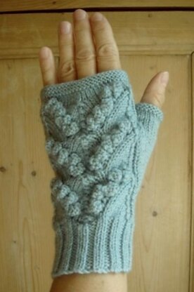 Knitting pattern for a pair of fingerless mitts/gloves with Lily-of-the-Valley lacy texture pattern with bobbles on the front. The same lacy pattern is on the palms of the gloves, but without the bobbles.