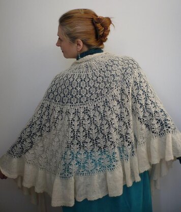 The shawl is constructed using Elizabeth Zimmermann's Pi Shawl construction, halved. The result is a semi-circular shawl that only has 7 or 8 increase rows (depending on whether you chose to do a ruffled edge or not). The increase rows are not within the lace charts, so whilst the shawl looks complicated, in reality it is not that complex as you do not have to try and fit in additional repeats of the charts.
