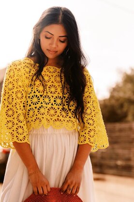 Limonata is a crocheted top featuring all-over wheel-shaped motifs in a lightweight yarn. The full motifs are worked in the round and are joined as you work. Half motifs are worked in rows to complete the sleeves. Refer to diagram for motif placement.